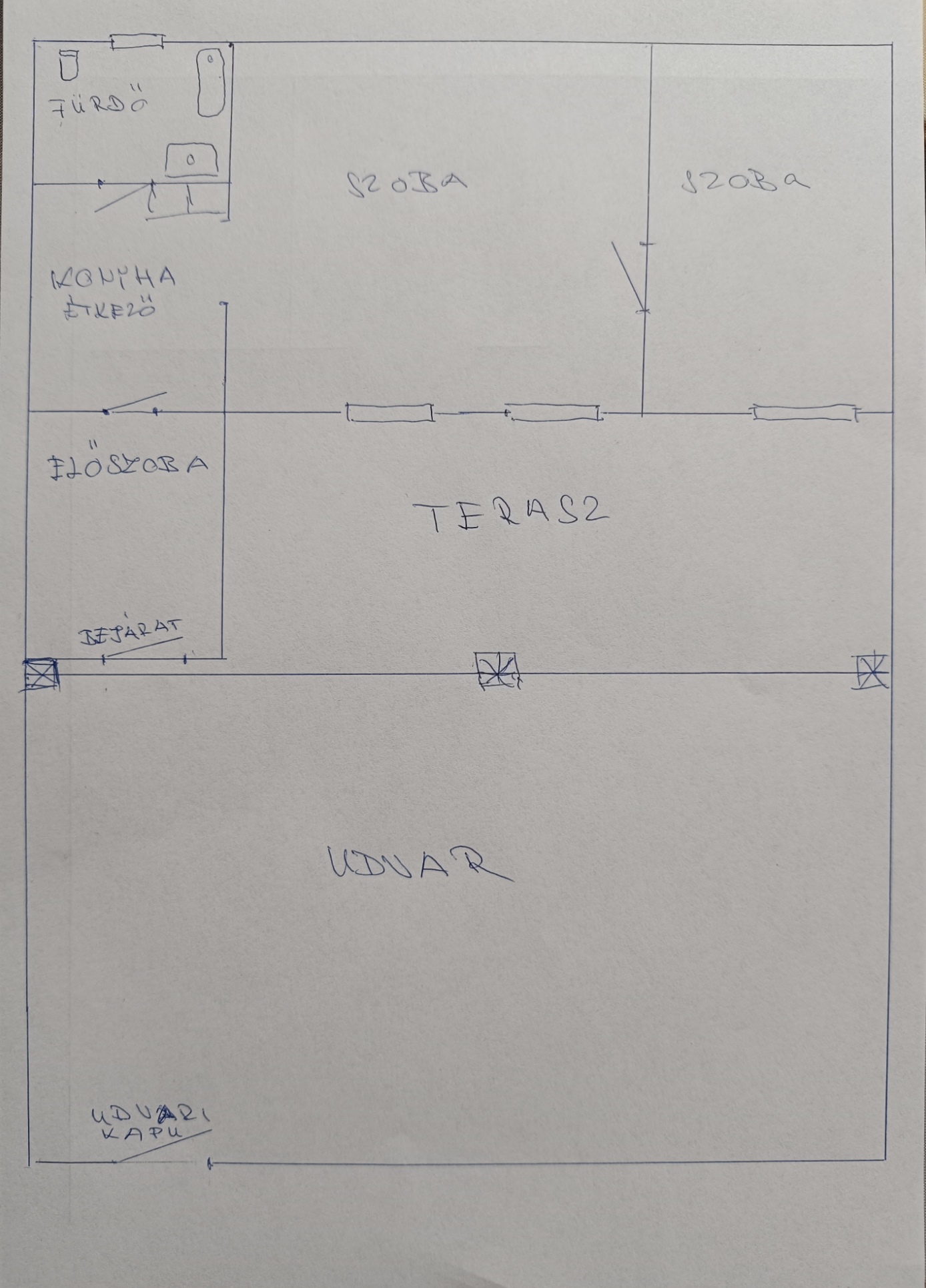 Földszinten 4 különnyíló szoba, nagy terasz (könnyen beépíthető ha szükséges)